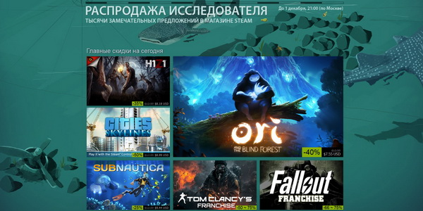 Steam не изменяет традициям и организовывает очередную большую распродажу. Сотни игр по скидкам вплоть до 80% (и даже больше) можно будет приобрести до 1 декабря. На главной странице магазина размещены предложения по франчайзам Fallout, Tom Clancy, Civilization, играм ARK: Survival Evolved, Crew, CS:GO, Left 4 Dead, ETS 2, Dark Souls, Dying Light и множество других.