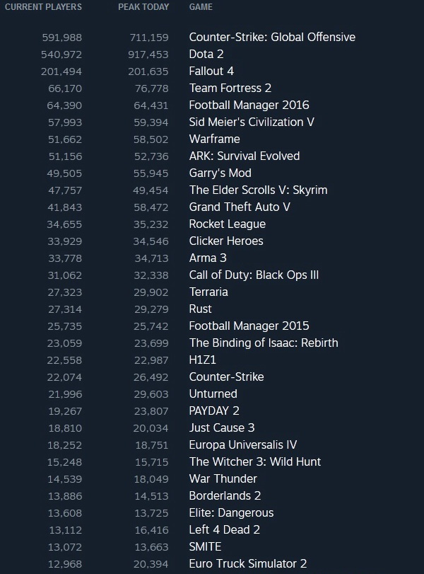 Лидер предыдущих недель Fallout 4 опустился на третье место, уступив по продажам GTA 5 и CS:GO. Новинка от Ubisoft Rainbow Six Siege заняла четвертую позицию, но не стоит забывать, что все копии, которые продаются в других магазинах мира – для платформы Uplay без привязки к Steam и не учитываются при составлении данного рейтинга.