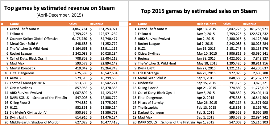 Итоги 2015 года платформы Steam подвел сервис SteamSpy, подсчитав продажи и активации игр. Данные могут быть не совсем точными, поскольку собраны на основе информации профилей пользователей, а также могут не полностью корректно учитывать колебания цен, но общую картину вполне отображают. К тому же при оценке количества проданных копий во внимание берутся как проданные копии в самом Steam, так и через сторонние магазины.